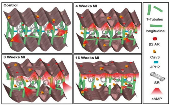 Progressive loss of the t-tubules and the increase of axial (longitudinal) elements of the TAT system demonstrate the change in cAMP signalling in the ventricular myocytes isolated from hearts with myocardial infarction (MI). Focus on the way in which β2-ARs are relocated and become more dispersed throughout the cell. As the disease progressively worsens, the loss of TAT structure deviates further and further away, but still attempts to generate signalling that keeps myocytes functional. Taken from Schobesberger et al., 2017 [45].