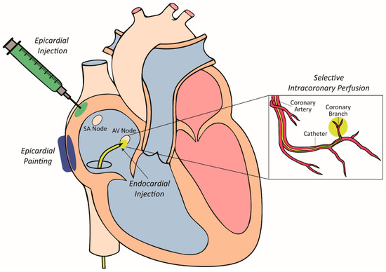 The ideal site of injection in the context of SAN dysfunction would be in the region of the SAN itself. This would ensure synchronous atrial and ventricular activation provided the AV node and the remainder of the conduction system was intact. Injection at other sites within the atrium could also achieve this but perhaps with reduced efficiency due to separation from the native conduction system. Effective, minimally invasive approaches to atrial gene delivery have not yet been developed. The approach used in most of the large animal studies to date to overcome this limitation has been to inject vector into the right ventricle [75,76]. Within this chamber, injection into the septum in the region of the bundle of His allows the biological pacemaker to capture the natural conducting system and avoid ventricular desynchrony. As such, the following sections discuss the most common approaches for delivering viral vectors to these sites.