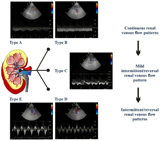 - Jeong, S.H.; Jung, D.C.; Kim, S.H.; Kim, S.H. Renal venous doppler ultrasonography in normal subjects and patients with diabetic nephropathy: Value of venous impedance index measurements. J. Clin. Ultrasound 2011, 39, 512–518. [Google Scholar] [CrossRef] [PubMed]