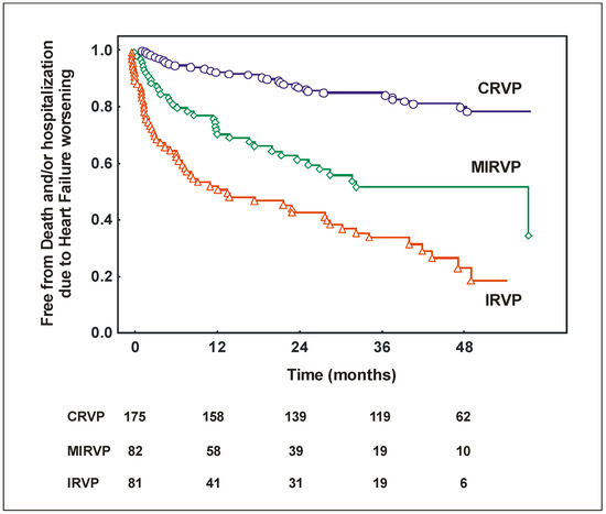 Figure 2 shows Kaplan Meier curves for the occurrence of death/hospitalization due to heart failure worsening and for the occurrence of death for all causes in patients with CRVP, MIRVP and IRVP.