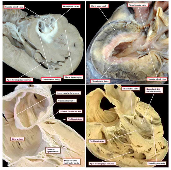 This variant is associated with stenosis of the mitral valve and usually with aortic atresia. The typical feature of the hypoplastic left ventricle in this variant is the thick layer of fibroelastosis that lines its cavity. In the setting of aortic atresia, the hypoplastic ascending aorta serves as no more than a conduit, which feeds the coronary arteries in retrograde fashion. In some instances, nonetheless, the aortic valve can be critically stenotic rather than atretic but still with a thick walled and hypoplastic left ventricle, which again has a fibroelastotic lining (Figure 1, upper right-hand panel). In the second commonest phenotypic pattern, the mitral valve is atretic rather than stenotic (Figure 1, lower left-hand panel). This variant is always associated with aortic atresia. Because of the mitral atresia, blood has never been able to enter the left ventricle. In consequence, the cavity of the ventricle is slit-like or exceedingly diminutive. Its walls are much thinner than is the case when the mitral valve is stenotic. The endocardial lining of the left ventricle also lacks the fibroelastotic layer characteristic of mitral stenosis (see upper panels of Figure 1). There is then a third variant, which is the least frequent. In this type, the mitral and aortic valves are both small, but their size is in keeping with that of the hypoplastic left ventricle (Figure 1, lower right-hand panel). This variant has been described as the “hypoplastic left heart complex” [6]. Some would describe the entity as no more than a severe aortic coarctation with associated left ventricular hypoplasia, since it is the obstructed aortic arch that is the most obvious feature of the pattern. The majority of the hearts initially described by Noonan and Lev were of this type. Examples of this variant, nonetheless, are to be found in historical archives having been classified as representing “hypoplastic left heart syndrome” by the pathologists making the initial diagnosis [5]. Of greater significance is that, to date, the mechanisms underlying the development of any of the different variants remain unknown.