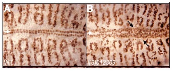 - Hartenstein, A.Y.; Rugendorff, A.; Tepass, U.; Hartenstein, V. The function of the neurogenic genes during epithelial development in the Drosophila embryo. Development 1992, 116, 1203–1220. [Google Scholar] [PubMed]