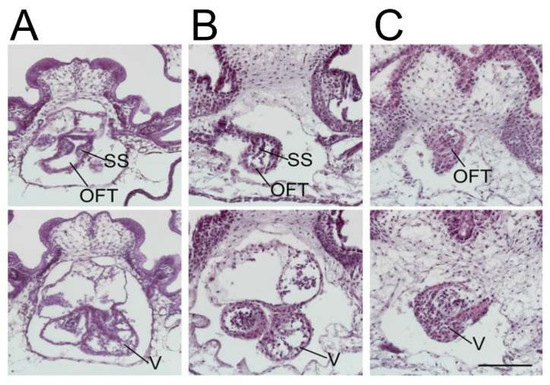The ETS-1 knockdown (KD) in a frog. (A) Wildtype (B) neural crest KD, and (C) heartfield KD. SS = spiral septum; OFT = outflow tract; and V = ventricle. The knockdown of ETS-1 only in the neural crest results in outflow tract defects, but a normal ventricle indicates that additional factors are required for the development of the “hypoplastic” ventricle. The knockdown of ETS-1 in the cardiac mesoderm causing the “hypoplastic” left ventricle indicates a mesodermally derived factor contributes to the development of the “hypoplastic” left ventricle (Reproduced with permission from Nie S and Bronner S, 2015).