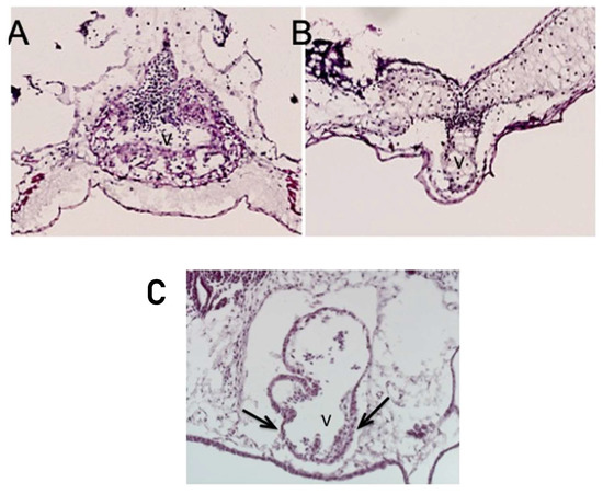 The panels show the result of the knockdown of the cardiac mesoderm-specific ETS-1 knockdown in the frog. The upper left panel (A) shows a control heart, while the upper right (B) and lower (C) show knockdown hearts. The lower panel is particularly significant, with the arrows showing a mixed ventricular phenotype, with differential thinning and thickening of the wall. Abbreviation: V: ventricle.