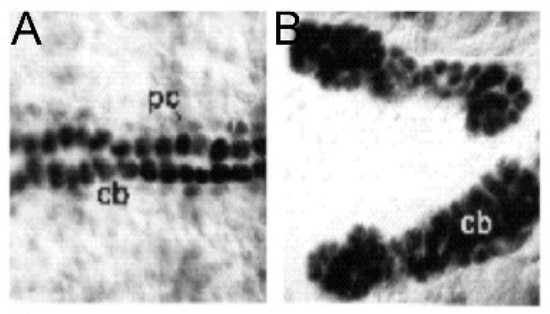 The Drosophila NOTCH mutant heart: (A) a normal heart and (B) a mutant heart. Similar to ETS1 mutants, there is a loss of pericardial cells (pc) and a gain of cardiac myocytes (cb). (Reproduced with permission from Hartenstein A., et al., 1992).