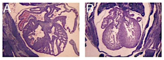 The transgenic overexpression of BMP10 in the developing murine left ventricle (A) results in a hypertrabeculated LV in which the chamber volume is severely diminished. The wildtype control is shown in B. (Reproduced with permission from Pashmforoush M., et al., 2004).