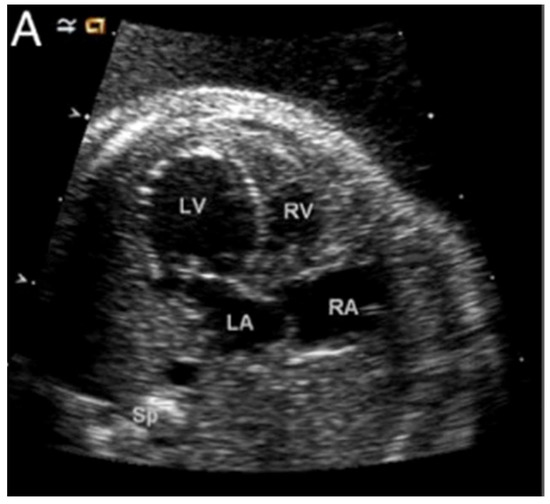 A fetal echo of a 22-week fetus with hypoplastic left heart syndrome here shown with a dilated, apex-forming, poorly functioning left ventricle. Abbreviations: LV: left ventricle; RV: right ventricle; LA: left atrium; and RA: right atrium (Reproduced with permission from Feinstein J., et al., JACC, 2011).
