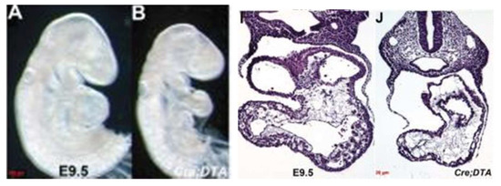 The mechanisms leading to the transition from the dilated and poorly function left ventricle to the typical thick-walled ventricle thus far remain unknown. It is intuitive, nonetheless, to suggest that there is initially an arrest in the growth of the left ventricle compared to the right, followed by a thickening of the left ventricular wall. Relevant to this, a potential direct role for the endocardium in the development of the left ventricle was tested by Conway and his associates [29]. They were able to genetically ablate the endocardium during the murine cardiac development. This was achieved by using an endocardial-specific CRE driver to express diphtheria toxin so as to engineer timed and targeted death of the endocardial cells. The perturbation arrested the growth of the left ventricle, resulting in embryonic lethality by E11 (Figure 8). These embryos appear similar to a subset of ETS1 cardiac mesodermal knockdown embryos shown above in that they exhibit growth arrest in the setting of a thin-walled and small left ventricle.