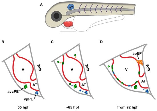 Schematic of epicardium formation in zebrafish. (A) Schematic of the anterior half of a zebrafish embryo. The framed region in (A) is enlarged to show details below (B–D); (B) at approximately 55 hpf, two PE clusters emerge from the mesothelial wall close to the atrioventricular canal (avcPE) and the venous pole PE (vpPE); (C) from approximately 65 hpf, cells are released (blue arrows) from the PE clusters and start to attach to the ventricular surface (orange arrows); (D) from 72 hpf, cells from the arterial pole epicardial precursor (apEP) pool (black arrow) are transferred to the ventricular surface through a cell bridge. V, ventricle; AT, atrium.
