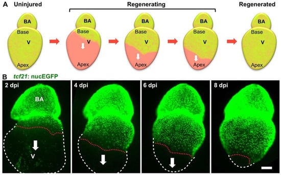 - Lepilina, A.; Coon, A.N.; Kikuchi, K.; Holdway, J.E.; Roberts, R.W.; Burns, C.G.; Poss, K.D. A dynamic epicardial injury response supports progenitor cell activity during zebrafish heart regeneration. Cell 2006, 127, 607–619. [Google Scholar] [CrossRef] [PubMed]