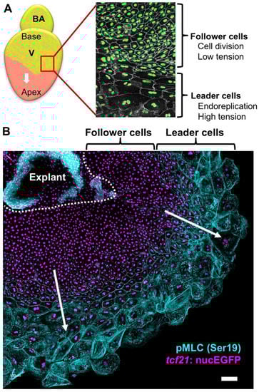 Two regions of the regenerating epicardial cell sheet. (A) Schematic of epicardial regeneration. The detail of the framed region of the regenerating epicardium is shown on the right. Nuclei are shown in green while cells are outlined in white. The epicardium forms two distinct domains: a leading edge of large, multinucleated leader cells followed by small, mononucleated follower cells. The follower cells have low cellular tension and undergo cell division, while the leader cells have high cellular tension and undergo endoreplication. (B) Migration of an epicardial cell sheet cultured in vitro showing two regions. Epicardial nuclei are labeled with tcf21:nucEGFP in violet. Immunostaining against phosphorylated myosin light chain 2 (pMLC, at Ser19, in cyan) was used as an indicator of mechanical tension. Scale bar: 100 μm.