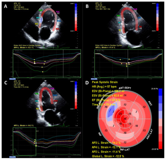 23. Collier, P.; Phelan, D.; Klein, A. A Test in Context: Myocardial Strain Measured by Speckle-Tracking Echocardiography. J. Am. Coll. Cardiol. 2017, 69, 1043–1056. [Google Scholar] [CrossRef] [PubMed]