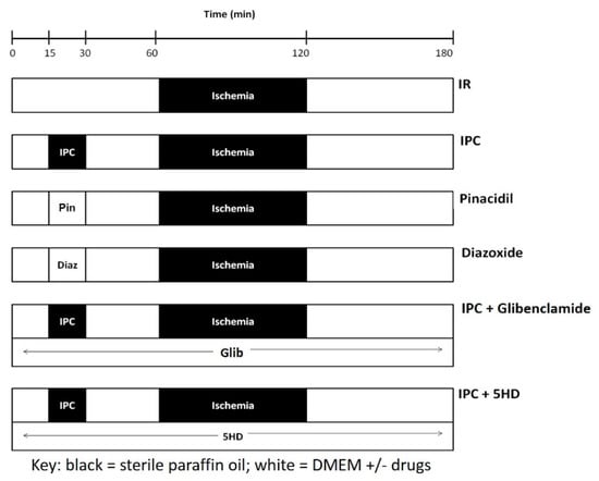 Dissociated cells were centrifuged and resuspended in DMEM. Cells exposed to KATP blockers were subjected to 15 min IPC and 30 min reperfusion followed by 60 min ischemia and 60 min reperfusion (Figure 1). Glibenclamide (Glib, 10 μM, Sigma) or 5-hydroxydecanoate (5HD, 100 μM, Sigma) were administered 15 min prior to the onset of IPC, and maintained throughout the protocol. In other cells, IPC was mimicked by adding pinacidil (Pin, 50 μM, Sigma) or diazoxide (Diaz, 100 μM, Sigma) in place of the 15 min IPC, prior to 60 min ischemia and 60 min reperfusion. Cells were then placed under culture conditions.