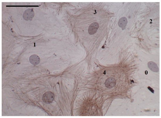 Cultured rat cardiac fibroblasts and myofibroblasts: characterization by α-smooth muscle actin (α-SMA) staining and stress fiber formation. Fibroblasts (0) were characterized by an absence of α-SMA staining, having no stress fibers. Both fully mature and immature myofibroblasts expressed α-SMA stress fibers, with the rating (1–4) reflecting the degree to which stress fibers filled the cell. Scale bar = 50 μm; magnification = 400×.