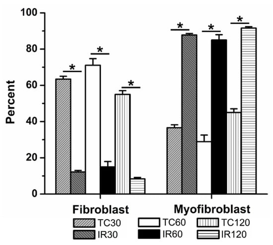 Ischemia reperfusion (IR) induced significant fibroblast to myofibroblast differentiation following 30, 60, and 120 min ischemia, relative to time controls (TCs). TCs are shown for 30, 60, and 120 min. The average percent of fibroblasts and myofibroblasts relative to the total number of cells analyzed are shown, ± SEM. * p < 0.05 between IR and TC for each time.