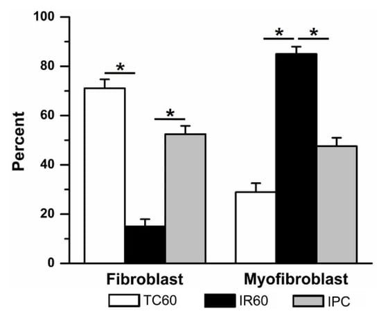 Ischemic preconditioning significantly attenuated IR-induced fibroblast differentiation (Figure 5). The IPC group had significantly more fibroblasts (52 ± 3%, (7)) compared to 60 min IR alone. These results suggest that while IR injury induced significant fibroblast-to-myofibroblast differentiation, IPC was able to protect against this effect. In time controls where cells were exposed to fresh DMEM in place of oil at each ischemic stage of the IPC/IR protocol, 72 ± 5% (4) of the cells were fibroblasts.