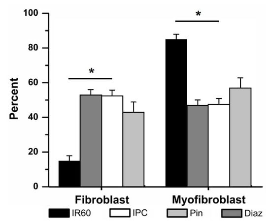 Similarly, Diaz significantly attenuated the IR-induced fibroblast to myofibroblast differentiation (Figure 6). Pretreatment with Diaz (100 µM) in place of IPC prior to 60 min IR, was associated with cultures containing 53 ± 3% (4) fibroblasts, significantly more than in the IR group. The percentage of fibroblasts within the Diaz-treated cells was not significantly different than that of the IPC groups. Neither drug affected fibroblast differentiation when tested in the time controls: when Pin was added to cells and subjected to the same protocol as the IPC cells, but without ischemia, 63 ± 9% (4) of the culture were fibroblasts, compared to 72 ± 5% (5) of cells in the IPC time controls. With Diaz present but no ischemia, 56 ± 13% (3) of the population were fibroblasts.