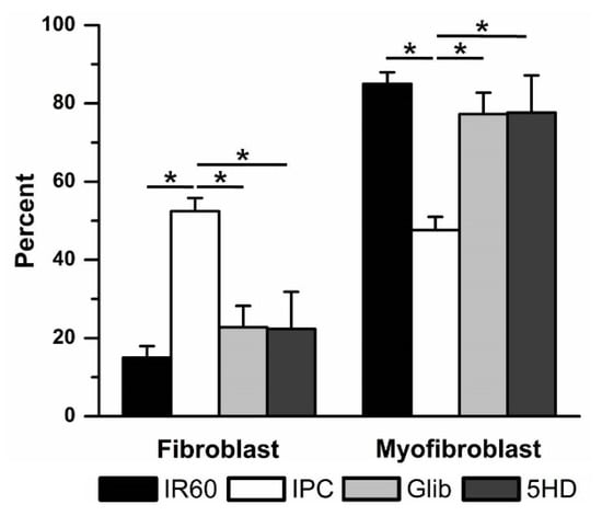 Ischemic preconditioning (IPC) could be mimicked by activating KATP channels with the non-specific opener pinacidil (Pin) and the mKATP—selective opener diazoxide (Diaz). Replacing IPC with Pin (50 μM) or Diaz (100 μM) attenuated ischemia reperfusion (IR)-induced fibroblast to myofibroblast differentiation. * p < 0.05, IR vs. IPC and Diaz. The relative percentages of fibroblasts vs. myofibroblasts in IPC, Pin and Diaz were not significantly different.