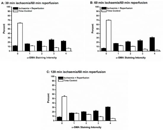 Ischemia reperfusion (IR) injury was associated with differentiation of fibroblasts into both immature and mature myofibroblasts. Each of the three durations of ischemia, 30 min (A), 60 min (B) and 120 min (C), yielded both immature (α smooth muscle actin (α-SMA) staining intensities 1–3) and mature (α-SMA staining intensity 4) myofibroblasts. In contrast, in each time control (TC), there were significantly more fibroblasts (α-SMA staining intensity 0), and of those fibroblasts that did differentiate, the resultant myofibroblasts tended to express less α-SMA stress fibers.