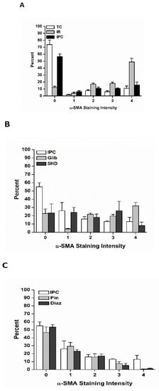 Ischemic preconditioning (IPC) influenced the relative proportions of immature vs. mature myofibroblasts. (A): IPC (black bars) was associated with a significantly higher percentage of fibroblasts (α smooth muscle actin (α-SMA) staining intensity 0) and fewer fully mature myofibroblasts (α-SMA staining intensity 4) and a trend for immature myofibroblasts (α-SMA staining intensities 1–3). These trends were also observed when IPC was mimicked by opening KATP channels with pinacidil (Pin) (B) or diazoxide (Diaz) (B). In contrast, blocking KATP channels with either glibenclamide (Glib) (C) or 5-hydroxydecanoate (5HD) (C) was associated with fewer fibroblasts (α-SMA staining intensity 0) than following IPC (B,C).