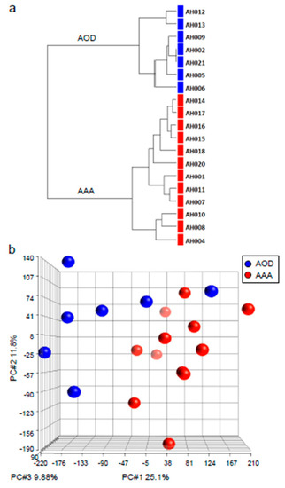 (a) Hierarchical clustering dendrogram of AAA (adominal aortic aneurysm) and AOD (arterial occlusive disease) samples. (b) Principal component analysis lot of AAA and AOD samples. In red the AAA patient samples, in blue the AOD patient samples. On the x, y, and z axis: PC#1 25.1%, PC#2 11.8%, PC#3 9.88%, respectively.