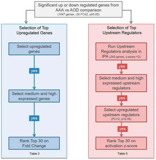 Selection procedure flowchart of the top upregulated genes (left) and top upstream regulators (right).