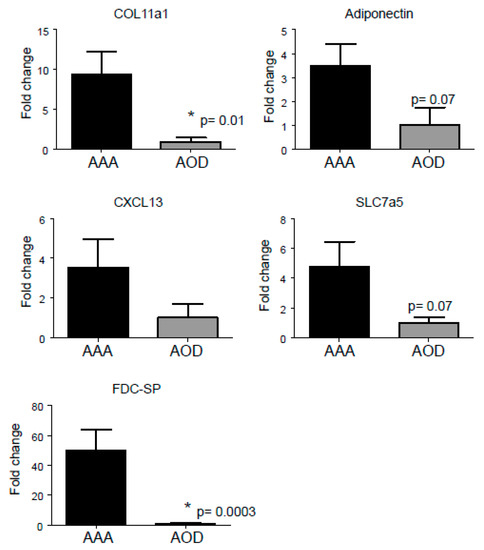 qPCR analysis of significantly regulated genes from the top 10 selection (Table 4), verified by qPCR. Plotted are the fold changes of COL11A1, ADIPOQ, CXCL13, SLC7a5, and FDCSP gene (AAA versus AOD n = 5). * p < 0.05 versus AAA.