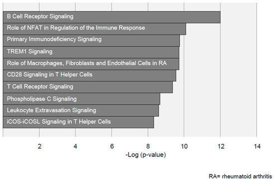 List of the top 10 significantly upregulated pathways in AAA disease identified with Ingenuity Pathway Analysis (IPA). The –log(p) value depicted on the x-axis represents significance of the depicted pathways.