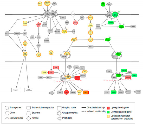 TGF-β signaling pathway with mediators in the TGF-β pathway and BMP pathway are depicted, adapted from IPA. Upregulated genes in red, down regulated genes in green, and upstream regulators which are predicted to be upregulated in yellow.