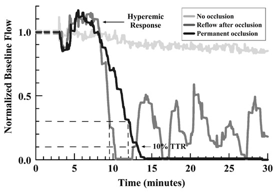 The main outcome measures were: 1) the initial TTO (at 25% of baseline flow), 2) the development or absence of any occlusion, and 3) the occurrence of embolism/reflow after occlusion (evidence of an unstable thrombus), and 4) the TTR for a first embolism relative to the TTO. Figure 1 shows representative curves for those encountered, identifying the types of outcome measures.