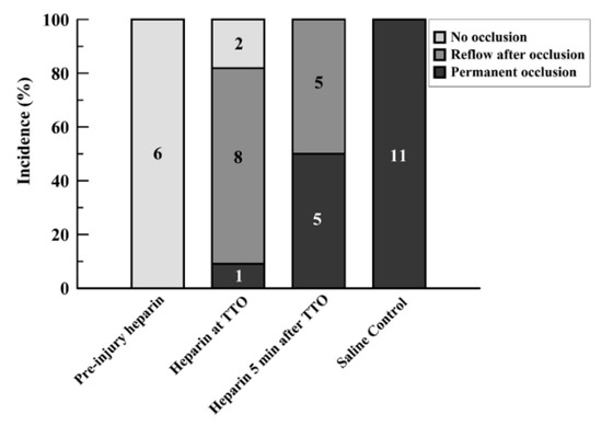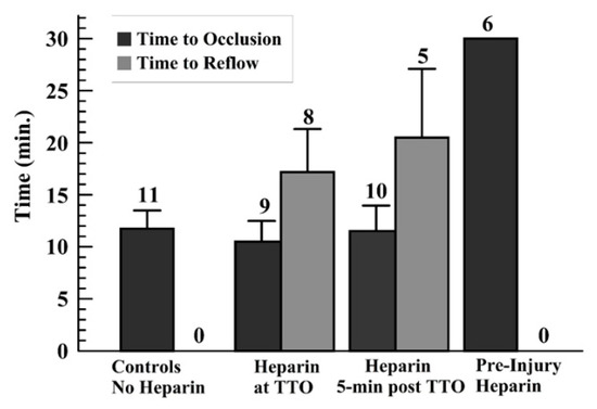 The following are available online at https://www.mdpi.com/2308-3425/7/1/10/s1, Figure S1: Supplemental Figure S1. All traces for the preinjury heparin series (Group 1), using a normalized baseline value of 1 for all traces, regardless of initial baseline flow (which varied among animals). None of the vessels showed signs of occlusion. Figure S2: All data traces for the group with heparin infused at the TTO (Group 2), using a normalized baseline value of 1 for all traces, regardless of initial baseline flow (which varied among animals). Figure S3: All data traces for the group with heparin infused 5 min after the TTO (Group 3), using the same criteria for graphing as in Supplemental Figure S1. Figure S4: All data traces for the control group (saline infused) at the time of TTO (Group 4), using the same criteria for graphing as in Supplemental Figure S1. Figure S5: “Survival Curve” style of graphic portrayal of the TTO data, stepping down the group number (%) as occlusion occurred (time) in each group. The TTR was not included as this created a more chaotic portrayal due to multiple reflow events in some lines after the first reflow event (TTR), causing a lot of up/down direction changes.