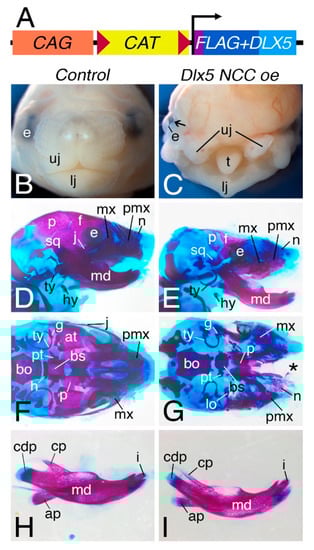 Neural crest cell (NCC)-specific Dlx5 overexpression results in midface clefting. (A) Diagram of the CAG-CAT-Dlx5 transgene. The CAG promoter drives expression of the Chloramphenicol acetyl transferase (CAT) gene that is flanked by loxP elements (triangles). Removal of Chloramphenicol Acetal transferase (CAT) via Cre-recombinase allows for persistent expression of Dlx5. (B,C). Anterior and ventral whole mount views, respectively, of E16.5 heads from Control (CAG-CAT-Dlx5) (B) and Wnt1-Cre; CAG-CAT-Dlx5 (Dlx5 NCC oe) (C) embryos. Compared to control embryos, the midface of Dlx5 NCC oe embryos contain a large cleft separating the upper jaw (uj) into left and right sides and exposing the tongue (t). The lower jaw (lj) also appears misshapen and a coloboma (arrow) is present. (D–I). E18.5 control (B,D,F,H) and Dlx5 NCC oe (C,E,G,I) embryos stained with Alizarin Red and Alcian Blue to visualize bone and cartilage, respectively. (D, E) Lateral views of skulls. In control embryos, the parietal (p) and frontal (f) are observed, which abut the squamosal (sq) bone (D). In the jaw region, the nasal (n), premaxilla (pmx), and maxilla (m) bones are observed, with the zygomatic process of the maxilla abutting the jugal (j) bone of the zygomatic arch. The tympanic ring (ty) bone is also observed. In Dlx5 NCC oe mice, the parietal, frontal bones are hypoplastic, as is the tympanic ring and squamosal bones (E). The premaxilla, maxilla, and jugal bones are dysmorphic, though the mandible appears relatively normal. (F,G) Ventral view of skulls with the mandible removed. In contrast to control embryos (F), most skull base bones in Dlx5 NCC oe embryos are hypoplastic, including the basisphenoid (bs), pterygoids (pt), and alisphenoids (al). The palatine (p) bones fuse along the midline but are also hypoplastic, as are the tympanic rings (G). The dysmorphology of the maxilla along the midline is also apparent, along with the large midline cleft that now exists (*). (H,I) Lateral (intra-oral) view of the left mandible (md). The coronoid (cp), condylar (cdp), and angular (ap) processes of the mandible are present in both control (H) and Dlx5 NCC oe (I) embryos, as are the incisors (i). bo, basisoccipital bone; e, eye; hy, hyoid bone.