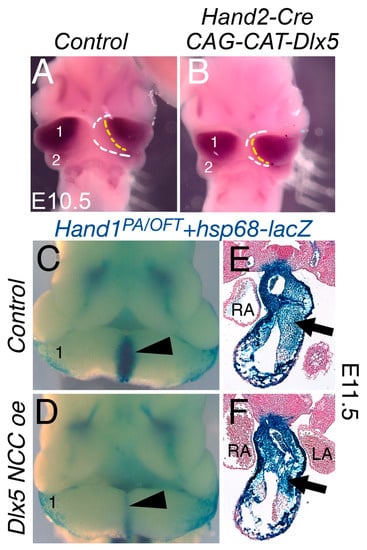 DLX5 regulates gene expression in post-migration cranial NCCs and, although expressed in cardiac NCCs, is not required for OFT morphogenesis, as heart defects are not reported in Dlx5;Dlx6 double knockout mice [12,23,24,25,26,27]. DLX5 negatively regulates Hand1 expression [8] and positively regulates Hand2 expression [6,28] in cranial NCCs. To ensure that the Cre-activated transgene is functional, we first intercrossed CAG-CAT-Dlx5 mice with the Hand2-Cre driver (Figure 2) [3]. E10.5 whole mount in situ hybridization of Dlx5 shows normal robust dorsal expression where the yellow line demarks its ventral most expression and the white line shows the ventral most cap of the arch of control embryos (Figure 2A). Cre-activation of the CAG-CAT-Dlx5 allele reveals a noticeable expansion of Dlx5 expression ventrally such that the space between the yellow and white lined marked boundaries is noticeably reduced, which indicates the efficacy of the Cre-inducible CAG-CAT-Dlx5 allele (Figure 2B). We next intercrossed CAG-CAT-Dlx5 mice with our Hand1PA/OFT-lacZ reporter line, which we have previously shown is sensitive to DLX5 negative regulation [8]. At E11.5, control embryos show expected cranial and cardiac NCC expression as well as the second heart field derived myocardium of the myocardial cuff (Figure 2C). Most notably, the ventral most NCC of the mandibular arch strongly expresses the Hand1PA/OFT-lacZ reporter (1, arrowhead, Figure 2C, n = 4). When Hand1PA/OFT-lacZ reporter expression is combined with the Wnt1-Cre; CAG-CAT-Dlx5 alleles, significantly reduced β-galactosidase staining is observed within the ventral cap domain of arch 1 (Figure 2D arrowhead, n = 4). Transverse sections through the cardiac OFT reveal robust β-galactosidase staining within the NCC mesenchyme and OFT myocardium (Figure 2E arrow). In Dlx5 NCC oe; Hand1PA/OFT -lacZ mice, the β-galactosidase staining intensity is unchanged. However, the ventral boundary of the β-galactosidase positive NCCs is more dorsal (Figure 2F arrow).