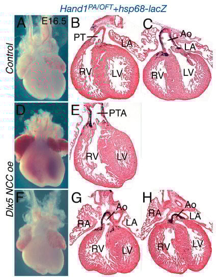 Phenotypic analysis of Dlx5 NCC oe hearts at E16.5. Whole mount (A) and frontal sections (B,C) of control (CAG-CAT-Dlx5;Hand1PA/OFT-lacZ) heart showing patent septation and proper alignment of the pulmonary trunk (PT) and aorta (Ao) with the right (RV) and left (LV) ventricles. Wholemount Dlx5 NCC oe hearts at E16.5 reveal persistent truncus arteriosus (PTA, D,E) or double outlet right ventricle (F–H) wherein the aorta is connected to both RV: right ventricle and LV; left ventricle, RA: right atria, LA: left atria.