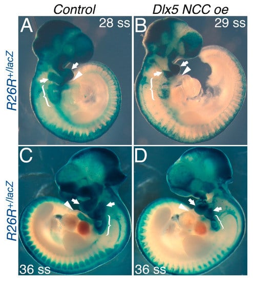 NCC lineage analysis of Dlx5 NCC oe E9.5 and E10.5 embryos. (A) E9.5 Wnt1-Cre; R26RlacZ/+ embryo stained for β-galactosidase activity. Blue stained cells represent NCC migration through the embryo. Cranial NCCs populating the first and second pharyngeal arches are noted by arrows. Cardiac NCCs occupying the caudal pharyngeal arches are denoted by brackets. NCCs within the outflow tract (OFT) are denoted by arrowheads. (B) NCC lineage analysis in Dlx5 NCC oe embryos shows reduced first and second pharyngeal arch size (arrows) and reduced cardiac NCC number dorsal to and within the OFT. (C) Control and (D) Dlx5 NCC oe embryo NCC lineage analysis at E10.5 demonstrate that the cranial arches are hypoplastic in Dlx5 NCC oe embryos when compared to control embryos (arrows). Reduced numbers of cardiac NCCs (brackets) and NCCs within the OFT (arrowheads) are also observed.
