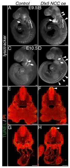 Lysotracker and Terminal deoxynucleotidyl transferase. dUTP nick end labeling (TUNEL) staining of Dlx5 NCC oe embryos. (A) E.9.5 control embryo showing normal cell death within the head and tissues dorsal to the OFT (brackets). No significant apoptosis is observed within the first and second pharyngeal arches (arrow). (B) E9.5 Dlx5 NCC oe embryo showing visible cell death within the neural tube (arrowheads) and, most notably, within the first and second pharyngeal arches (arrow). (C) E10.5 control embryo showing normal cell death. Arrows denote cell death within the proximal rostral pharyngeal domain of the first and second pharyngeal arches. (D) E10.5 Dlx5 NCC oe embryo showing persistent dorsal neural tube cell death, whereas first and second pharyngeal arches show less apoptosis than controls. (E) and (F) E10.5 TUNEL stained control and Dlx5 NCC oe embryos. Elevated cell death within the neural tube of Dlx5 NCC oe embryos is clearly visible (arrowhead), as are the hypoplastic first and second pharyngeal arches. (G,H) more caudal sections showing minimal cell death within the cardiac OFT in control and Dlx5 NCC oe embryos. Scale bars = 200 μm.