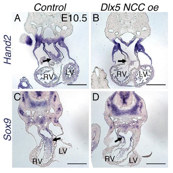 Expression of the OFT markers Hand2 and Sox9 is reduced within Dlx5 NCC oe embryos. (A,B) In situ hybridization showing expression of Hand2 within control (A) and Dlx5 NCC oe (B) E10.5 embryo hearts. (C,D) E10.5 control (C) and Dlx5 NCC oe (D) embryos showing Sox9 mRNA expression. Arrows denote cardiac NCC. Scale bars = 250 μm.