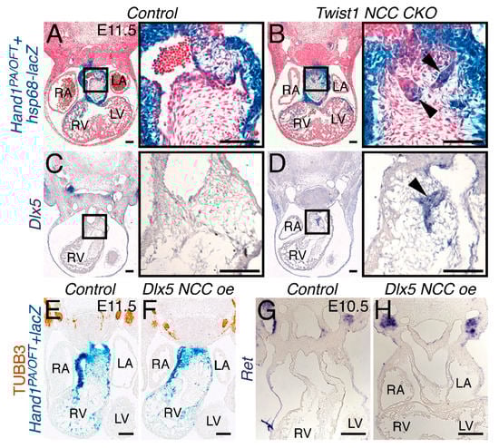 Loss of TWIST1 function induces NCCs to differentiate along a neuronal cell fate [13]. Within the OFT, Twist1-null cardiac NCCs organize into ganglia-like structures and express a number of neuronal genes [13]. Additionally, these trans-differentiating cardiac NCCs express Hand1 [13]. Crossing the Hand1PA/OFT-lacZ reporter onto a Twist1–/fx, Wnt1-Cre(+) background (Twist1 NCC CKO) reveals that these NCCs are specifically marked by Hand1PA/OFT enhancer activity (Figure 7B, arrowheads). Intriguingly, these ganglia-like structures also express Dlx5 (Figure 7D, arrowhead, n = 3), which is not detectable in the cardiac NCCs of control OFTs (Figure 7C). To determine whether persistent Dlx5 expression within the NCCs promotes cardiac NCC populations to differentiate along a neuronal path, we looked at the expression of the pan-neuronal marker Class III β-TUBULIN (TUBB3) [32] and the receptor tyrosine kinase Ret, which marks NCC-derived neurons [33]. TUBB3 immunostaining of E11.5 embryos on the Hand1PA/OFT-lacZ reporter background revealed no detectable TUBB3 protein within OFT NCCs of either control or Dlx5 NCC oe embryos (Figure 7E,F, n = 2). Ret in situ hybridization of E10.5 embryos yielded similar findings (Figure 7G,H, n = 4). These results show that, although Dlx5 expression is induced in ectopic neurons within Twist1-null cardiac NCCs, ectopic Dlx5 expression within the cardiac NCCs is not sufficient to induce neurogenesis.