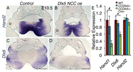 Dlx5 NCC overexpression downregulates Dlx6 within the first pharyngeal arch. (A, B) Hand2 in situ hybridization showing normal first arch expression in both control (A) and Dlx5 NCC oe E10.5 embryos. Dlx6 in situ hybridization showing altered first arch expression when comparing control (C) and Dlx5 NCC oe embryos (D). (E) qRT-PCR analyses of Hand1, Dlx6, and Hand2 expression from E10.5 first pharyngeal arches. Significant decreases in Hand1 (# p ≤ 0.01) and Dlx6 (* p ≤ 0.05) are observed. No significant changes in the Hand2 message are detected. Scale bars = 250 μm.