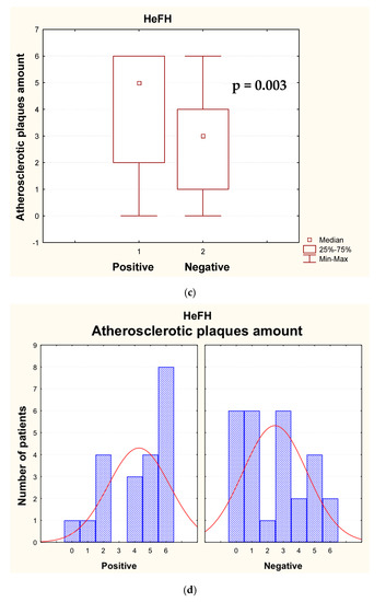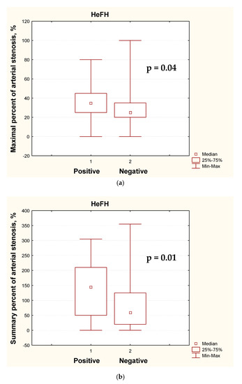 The carotid duplex ultrasound data in mutation-positive (1) and mutation-negative (2) patients with clinically established heterozygous familial hypercholesterolemia (HeFH): (a) maximal percent of arterial stenosis; (b) summary percent of arterial stenosis; (c,d) atherosclerotic plaques amount.