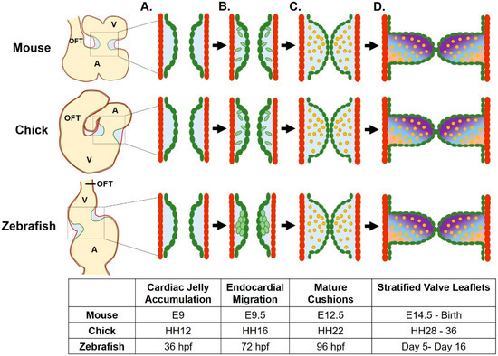 - Pestel, J.; Ramadass, R.; Gauvrit, S.; Helker, C.; Herzog, W.; Stainier, D.Y.R. Real-time 3D Visualization of Cellular Rearrangements during Cardiac Valve Formation. Development 2016, 143, 2217–2227. [Google Scholar] [CrossRef] [PubMed]