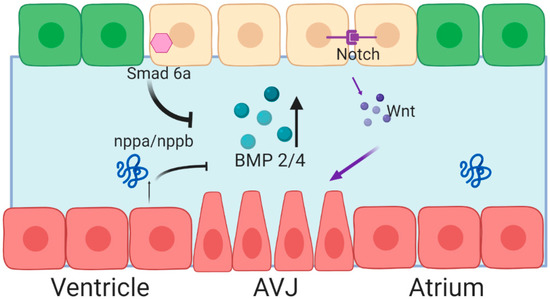 Spatiotemporal expression of Bone Morphogenetic Protein (BMP) 2/4 is achieved through activation at the AVJ, and repression through the cardiac chambers. Red cells represent myocardial cells, green cells represent endocardial cells, yellow cells represent valve-forming endocardial cells. Blue space between the two cell layers represents the cardiac jelly. Figure created with BioRender.