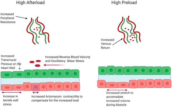 High afterload induces oscillatory shear stress, compressive pressure, and increased contractility resulting in increased tensile wall stress. High preload leads increased stretch to accommodate higher blood volumes during diastole. Figure created with BioRender.