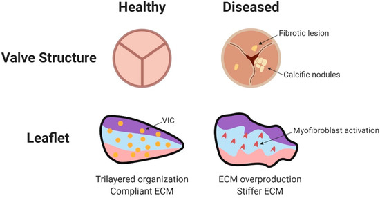 Disease pathology of adult valves. Diseased valves may exhibit calcification and fibrotic lesions. Accumulating pathology leads to leaflet calcification, valvular insufficiency, valvular stenosis, and increased cyclic wall strain. Within the valve leaflets, VICs transform to activated myofibroblasts. The increased production of collagen, elastin, GAGs, and matrix metalloproteases changes the architecture of the leaflet. Major mechanosensors in valvular endothelial cells include ECM components, Wnt and TGF-β signaling, G protein coupled receptors, cell adhesion molecules, and cytoskeletal components (reviewed in [95]). Figure created using BioRender. Citation for Figure 4: [95].