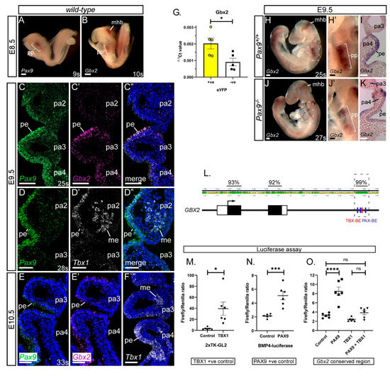 Gbx2 and Pax9 expression in the pharyngeal endoderm. (A–F) RNA in situ hybridisation was used to visualise transcripts in the normal developing embryo. At E8.5 whole embryo in situ hybridisation reveals Pax9 (A) and Gbx2 (B) expression in the pharyngeal pouch (pp) region. Gbx2 is also expressed in the mid-hindbrain (mhb) (n = 3 embryos per probe, 9–11 somites). (C–F) RNAScope probes were used on sections at E9.5 (n = 3, 24–28 somites) and E10.5 (n = 3, 33 somites). At E9.5 Pax9 and Gbx2 (C), and Pax9 and Tbx1 (D) co-localise to the pharyngeal endoderm. At E10.5 Pax9 (E), Gbx2 (E’) and Tbx1 (F), are all expressed in the pharyngeal endoderm. (G) qPCR on flow-sorted cells from Pax9Cre;eYFP E9.5 embryos (n = 5, 23–27 somites) shows a significant enrichment for Gbx2 in the eYFP-positive cells compared to eYFP-negative. * p < 0.05; two-tailed unpaired t-test. (H,J) Whole embryo in situ hybridisation at E9.5 in wild-type (H; n = 3, 24–26 somites) and Pax9−/− (J; n = 6, 23–27 somites) embryos. Gbx2 expression is reduced in the pharyngeal pouch in Pax9−/− embryos. (I,K) Sections of stained embryos revealed reduced Gbx2 staining in the pharyngeal endoderm in Pax9−/− embryos (K) compared to controls (I). (L) Diagram of the GBX2 locus showing the degree of conservation (%) between human and mouse GBX2 sequences. A 500 bp region, ~2kb down from the second, and final, GBX2 coding exon is 99% conserved and contains PAX (blue) and TBX (red) binding elements (BE). (M–O) Luciferase assays show that Pax9 activates the Gbx2 conserved region but Tbx1 does not (O). Controls for Tbx1 (M) and Pax9 (N) show significant activation of luciferase. Data presented as the mean ± s.e.m. of 6 individual experiments, each performed in triplicate. * p < 0.05, *** p < 0.01, **** p < 0.001. Scale bars: 100 μm in (A,B,H,J); 50 μm in (C–F),(H’, I, J’,K). Abbreviations: me, mesoderm; pa, pharyngeal arch; pe, pharyngeal endoderm; s, somites. The somite numbers given in the legend reflect the range analysed for the whole study. The figure contains representative images only.