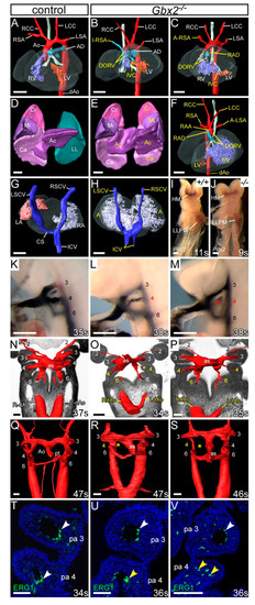 Analysis of Gbx2−/− embryos at E15.5 by magnetic resonance imaging (MRI) revealed that 64% (n = 16/25) had some form of cardiovascular developmental defect including aberrant right subclavian artery (A-RSA), right-sided aortic arch (RAA), right-sided arterial duct (RAD) and double-outlet right ventricle (DORV) (Figure 2A–C; Table 1), although interruption of the aortic arch (IAA) was not observed. Of these Gbx2−/− embryos with cardiovascular defects, 56% (n = 9/16) displayed additional overt left-right patterning defects such as right pulmonary isomerism, bilateral superior caval veins draining into a common right atrium (i.e., right atrial isomerism), and mirror-image aortic arch arteries (Figure 2D–H; Table 1). An enlargement of the right dorsal aorta, compared to the left, was also noted in two Gbx2−/− embryos analysed by high-resolution episcopic microscopy (HREM), indicating that these embryos would have developed an aberrant right-sided dorsal aorta by the foetal stage (Figure 2O,P). A left-right patterning phenotype in Gbx2−/− mice has not previously been reported. Left-right patterning is established via a Nodal-Pitx2c gene regulated pathway [43] and to investigate whether the left-right patterning defect was due to altered Pitx2c expression, whole-mount in situ hybridisation was performed on Gbx2−/− embryos at E8.5 (n = 6). No obvious change in Pitx2c expression, however, was observed in the left lateral plate mesoderm (Figure 2I,J).