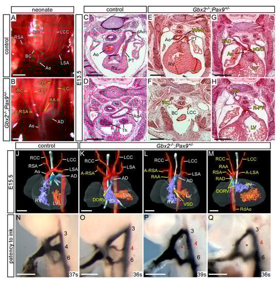 To see if a further reduction in Gbx2 and Pax9 alleles would result in a more penetrant cardiovascular phenotype, Gbx2+/−;Pax9+/− mice were intercrossed and embryos and neonates collected for analysis. Genotyping revealed that all mice null for Gbx2 were under-represented (p = 1.12 × 10−4; Table S3). We first analysed mutant mice null for Gbx2 and simultaneously heterozygous for Pax9 (i.e., Gbx2−/−;Pax9+/−). One Gbx2−/−;Pax9+/− neonate was recovered that died on the day of birth with IAA-B, A-RSA, and an absent left common carotid artery resulting in the left internal and external carotid arteries arising from the aortic arch and dorsal aorta as previously described in Pax9−/− embryos [25] (Figure 4A,B). Gbx2−/−;Pax9+/− embryos at E13.5 and E15.5 were examined for cardiovascular defects by histology and MRI respectively, which showed a significantly increased penetrance of OFT and arch artery defects compared to those observed in Gbx2−/− mice (100% versus 64%, p < 0.05; Figure 4C–M; Table 1). There was also a significant increase in the presentation of IAA-B in Gbx2−/−;Pax9+/− mice compared to Gbx2−/− mice (36% versus 0, p < 0.01; Figure 4B,E; Table 1), a defect not observed in our Gbx2−/− or Pax9+/− mice. We also observed a partial CAT (type A4 where the common trunk is associated with IAA [44]) in one Gbx2−/−;Pax9+/− embryo (Figure 4G), a phenotype not previously described in Gbx2-null and Pax9-null embryos [25,28,29]. Analysis of the PAA at E10.5 by ink injection revealed that all Gbx2−/−;Pax9+/− embryos had an affected 4th PAA, with a significantly higher incidence of bilateral 4th PAA defects compared to Gbx2−/− embryos (p < 0.05; Figure 4N–Q; Table 2).