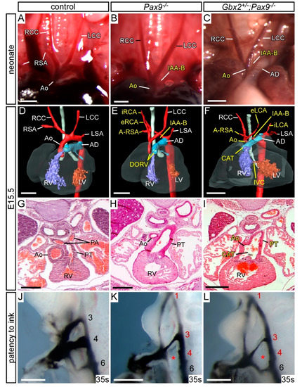 Cardiovascular defects in Gbx2+/−;Pax9−/− mice. (A–C) Neonates were dissected on the day of birth. (A) Arch arteries of control neonates were normal. (B) Pax9−/− (n = 2) and (C) Gbx2−/−;Pax9+/− (n = 2) neonates found dead on the day of birth displayed interruption of the aortic arch (IAA-B) and presumed aberrant right subclavian artery. (D–F) 3D reconstructions of E15.5 hearts from MRI datasets. (D) Gbx2+/+ control embryo with normal heart and aortic arch arteries. (E) Pax9−/− embryos (n = 7) presented with defects such as IAA-B, A-RSA, double outlet right ventricle (DORV), hypoplastic aorta and aberrant carotid arteries (eRCA, iRCA). (F) Gbx2+/−;Pax9−/− embryos (n = 7) showed typical Pax9−/− cardiovascular defects including IAA-B and absent common carotid artery, but also common arterial trunk (CAT). (G–I) E15.5 embryos were sectioned and stained with H&E. (G) Control embryos had a normal outflow tract. (H) Pax9−/− embryos had DORV (not shown) and hypolastic aorta. (I) Gbx2+/−;Pax9−/− embryo with CAT. (J–L) Embryos at E10.5 were analysed by intracardiac ink injection (35–38 somites). (J) Control embryos had normal PAAs patent to ink. (K) Pax9−/− embryos showed typical defects such as persistent 1st, hypoplastic 3rd and absent 4th PAAs (asterisk), as did Gbx2+/−;Pax9−/− embryos (n = 6; L). Scale bars: 1 mm in (A–C); 500 μm in (D–L). Abbreviations: Ao, aorta; AD, arterial duct; LCC, left common carotid artery; LSA, left subclavian artery; LV, left ventricle; PA, pulmonary artery; PT, pulmonary trunk; RCC, right common carotid artery; RSA, right subclavian artery; RV, right ventricle; s, somites. The somite numbers given in the legend reflect the range analysed for the whole study. The figure contains representative images only.