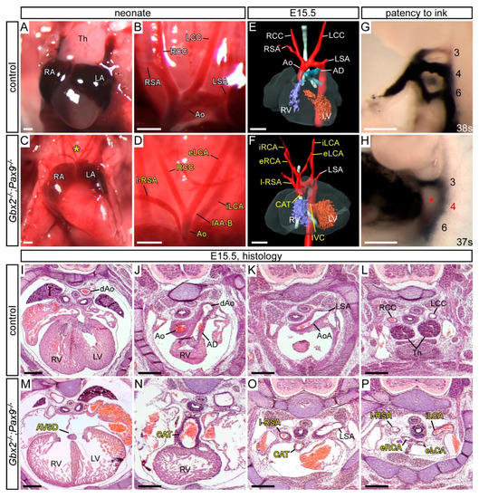 Cardiovascular defects in the three Gbx2−/−;Pax9−/− mutants recovered. (A–D) Neonates were dissected on the day of birth. The thymus (A) and arch arteries (B) were normal in controls, but in a Gbx2−/−;Pax9−/− neonate the thymus was absent (asterisk; C) and the arch arteries were abnormal (D) displaying interrupted aortic arch type B (IAA-B), isolated right subclavian artery (I-RSA) and abnormal left carotid arteries (eLCA, iLCA). (E,F) 3D reconstructions of E15.5 hearts from MRI datasets. (E) Control embryo with normal heart and aortic arch arteries. (F) Gbx2−/−;Pax9−/− embryo with IAA-B, I-RSA, common arterial trunk (CAT) with interventricular communication (IVC), and aberrant carotid arteries (eLCA, iLCA, eRCA, iRCA). (G,H) Embryos at E10.5 were analysed by intracardiac ink injection. (G) Control embryos had normal PAAs patent to ink. (H) Gbx2−/−;Pax9−/− embryo with a non-patent 4th PAA (asterisk). (I–P) H&E stained transverse sections of E15.5 embryos. (I–L) Control embryo with normal heart (I), outflow tract (J), aortic arch arteries (K,L) and thymus (Th; L). (M–P) Sections from the Gbx2−/−;Pax9−/− embryo depicted in F. (M) An atrioventricular septal defect (AVSD) is seen, as well as the CAT (N) with associated I-RSA (O) and aberrant carotid arteries (P). Scale bars: 500 μm. Abbreviations: AD, arterial duct; Ao, aorta; AoA, aortic arch; dAo, dorsal aorta; LA, left atrium; LCC, left common carotid artery; LSA, left subclavian artery; LV, left ventricle; RA, right atrium; RCC, right common carotid artery; RSA, right subclavian artery; RV, right ventricle.