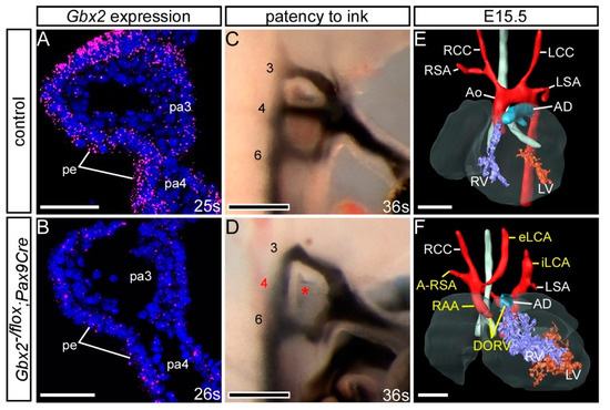 Conditional deletion of Gbx2 from the pharyngeal endoderm. Embryos with one Gbx2-null allele and a heterozygous conditional deletion of Gbx2 using Pax9Cre (Gbx2−/flox;Pax9Cre) were analysed. (A,B) RNAscope in situ hybridisation for Gbx2 at E9.5 (n = 5 per genotype; 24–29 somites). (A) In control embryos Gbx2 expression was observed in the pharyngeal endoderm (pe) of the pharyngeal arches (pa). (B) Gbx2 expression was reduced in the pharyngeal endoderm of Gbx2−/flox;Pax9Cre mutants. (C,D) Embryos at E10.5 were analysed by intracardiac ink injection (36–38 somites). (C) Control embryos had normal PAAs patent to ink. (D) Gbx2−/flox;Pax9Cre embryos (n = 14) showed PAA defects such as absent 4th PAAs (asterisk). (E,F) 3D reconstructions of E15.5 hearts from MRI datasets. (E) Control embryo with normal heart and aortic arch arteries. (F) A Gbx2−/flox;Pax9Cre embryo (from n = 14 analysed) with double-outlet right ventricle (DORV), right-sided aortic arch (RAA), aberrant right subclavian artery (A-RSA) and abnormal left external and internal carotid arteries (eLCA, iLCA). Scale bars: 50 μm in (A,B); 100 μm in (C,D); 500 μm in (E,F). Abbreviations: Ao, aorta; AD, arterial duct; LCC, left common carotid artery; LSA, left subclavian artery; LV, left ventricle; RCC, right common carotid artery; RSA, right subclavian artery; RV, right ventricle; s, somite. The somite numbers given in the legend reflect the range analysed for the whole study. The figure contains representative images only.